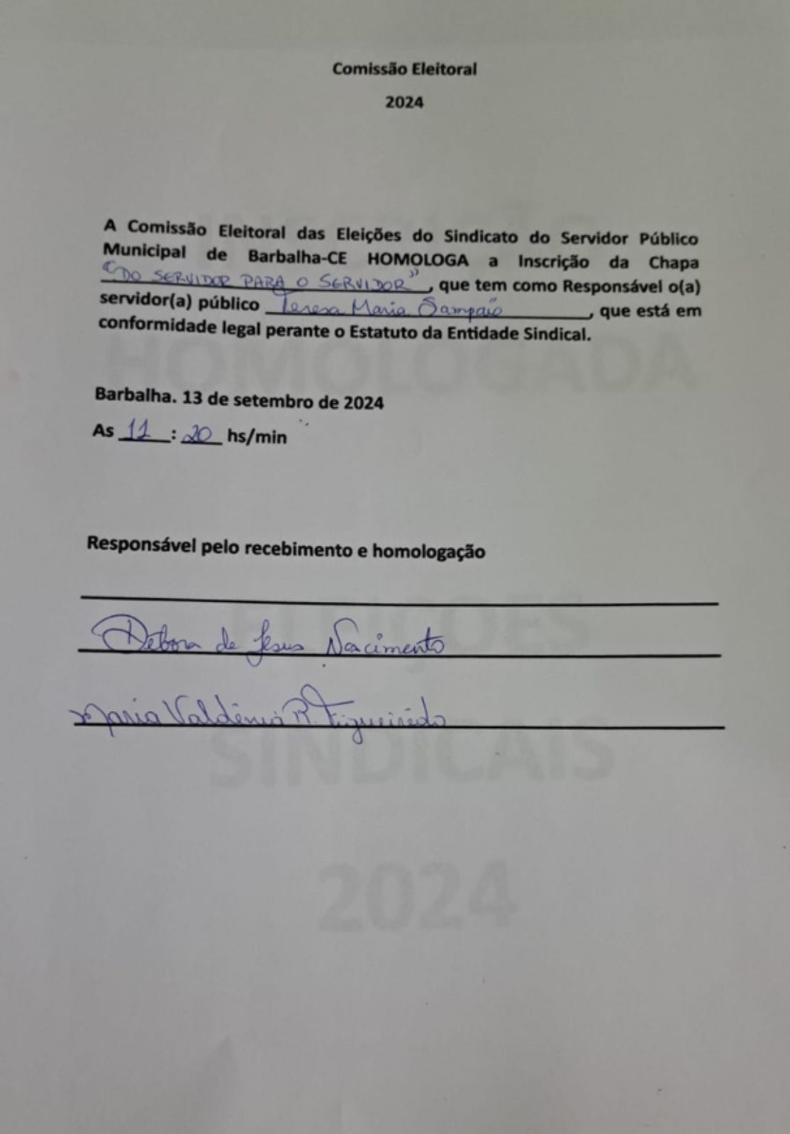 A Comissão Eleitoral do Sindicato do Servidor Público Municipal de Barbalha -CE encerrou nesta sexta-feira 13 as inscrições de chapas para concorrer as eleições sindicais que acontecerá em outubro de 2024. Chapa única fora homologada composta de 18 membros sendo 12 para cargos da Diretoria Executiva e 6 para membros do Conselho Fiscal : 3 titulares e 3 suplentes. A chapa é presidida por Teresa Maria Sampaio -Supervisora Educacional - e Tiago Rodrigues de Souza Vigia - *DO SERVIDOR PARA O SERVIDOR,* a equipe pretende continuar a luta em defesa dos direitos já garantidos, objetivando ampliar as conquistas demandadas em favor do Servidor Público.