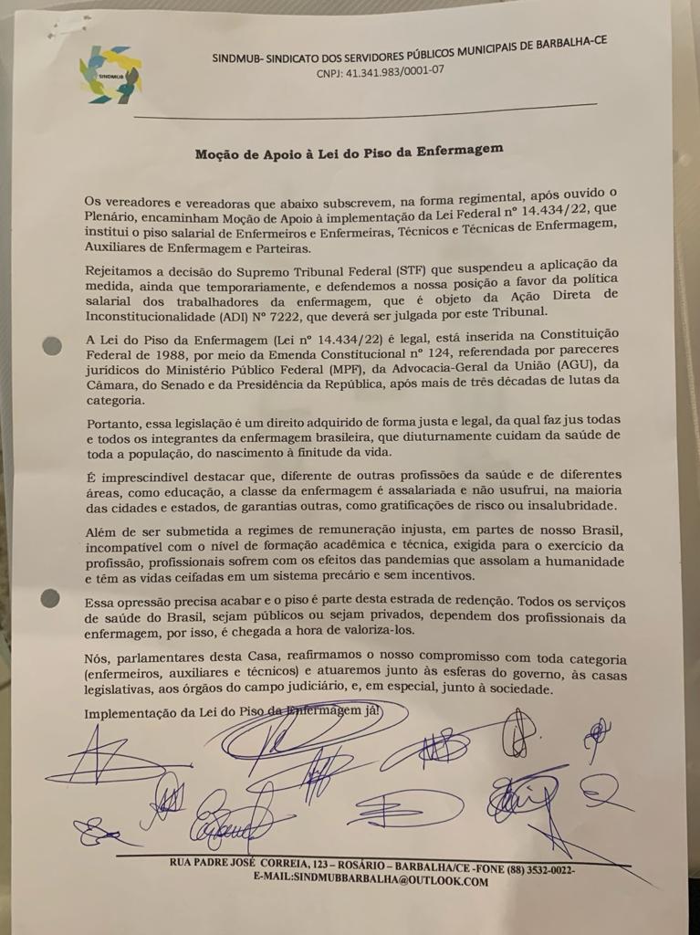 CÂMARA DE VEREADORES DE BARBALHA APROVA POR UNANIMIDADE MOÇÃO DE APOIO A IMPLEMENTAÇÃO DA LEI DO PISO SALARIAL DA ENFERMAGEM.