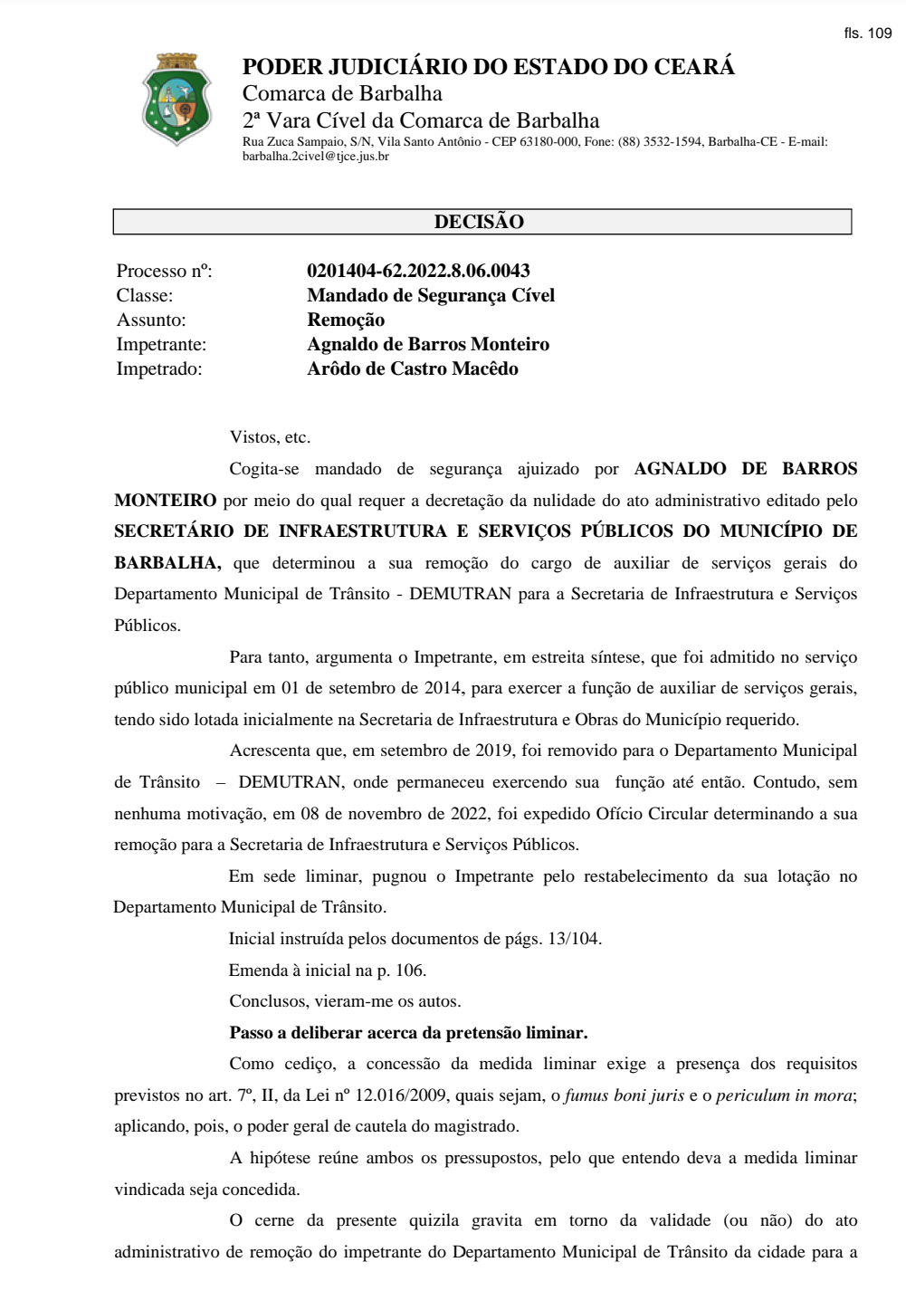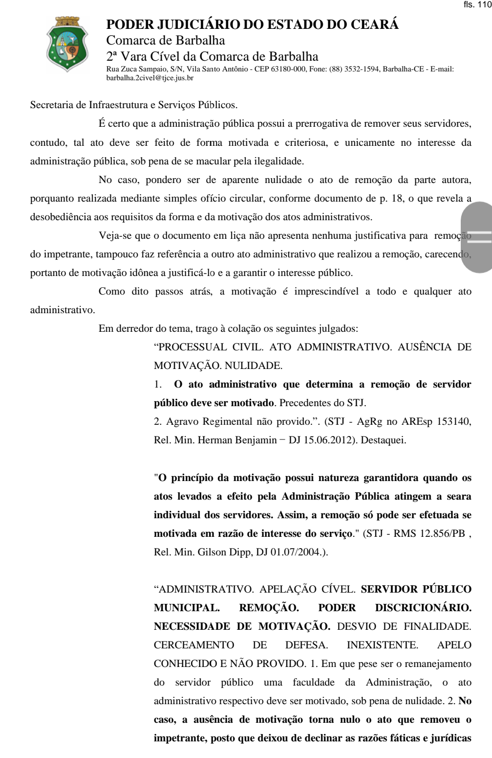 SINDMUB conquista no TJCE primeira nulidade de ato de transferência arbitrária do poder público municipal. O Servidor A de B M conquistou na justiça a nulidade do ato do secretário de infraestrutura e obras Arodo de Castro Macedo que o transferiu imotivadamente para outro departamento municipal. A juíza Ana Carolina Montenegro Cavalcanti deferiu o pedido liminar e suspendeu os efeitos do ato de remoção do impetrante e DETERMINOU ao Secretário de Infra-estrutura e Obras que restabeleça o vínculo do empregado no Departamento Municipal de Trânsito-DEMUTRAN, no prazo de 5 dias sob pena de multa diária de 1.000,00 (mil reais).
