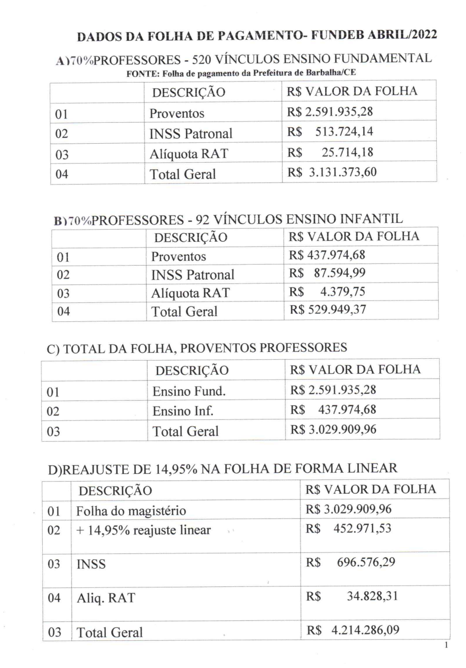 DADOS ESTATÍSTICOS MOSTRAM CAPACIDADE DO MUNICIPIO DE BARBALHA APLICAR O PERCENTUAL DE 14,95% NO PISO DO MAGISTÉRIO E NA CARREIRA DOS PROFISSIONAIS!!!