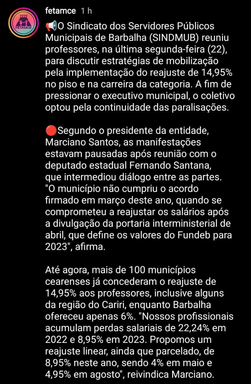 Fetamce - Após Assembleia, professores de Barbalha decidem manter paralisações. 24/05/2023 0 Comentário(s) #Compartilhe