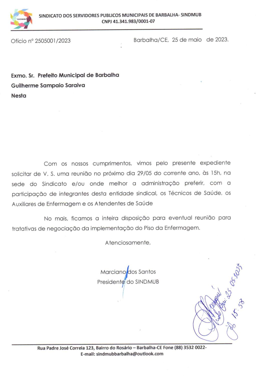 Segue para conhecimento de todos o oficio encaminhado ao Prefeito municipal, solicitando uma reunião de preferência, no próximo dia 29/05 do corrente ano, às 15h, na sede do Sindicato ou onde melhor a administração preferir, com a participação de integrantes do sindicato, dos Técnicos de Saúde, dos Auxiliares de Enfermagem e dos Atendentes de Saúde, para tratarmos da implementação do piso nacional da enfermagem.