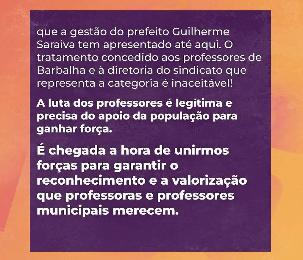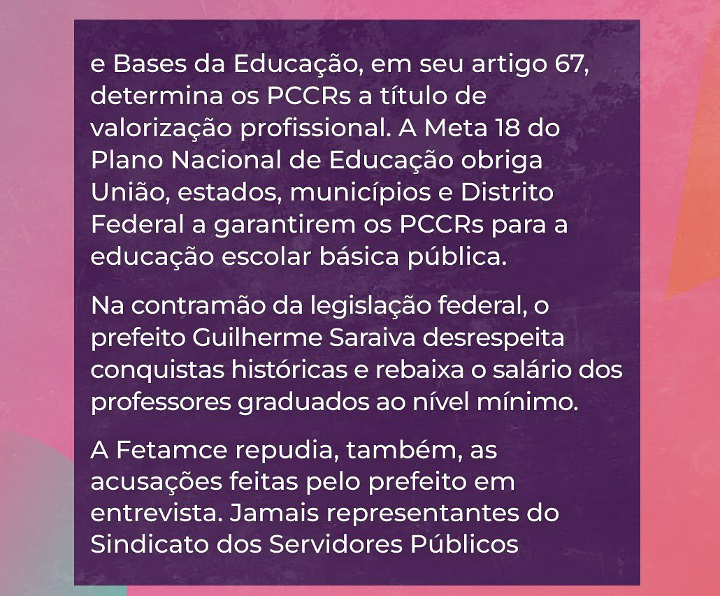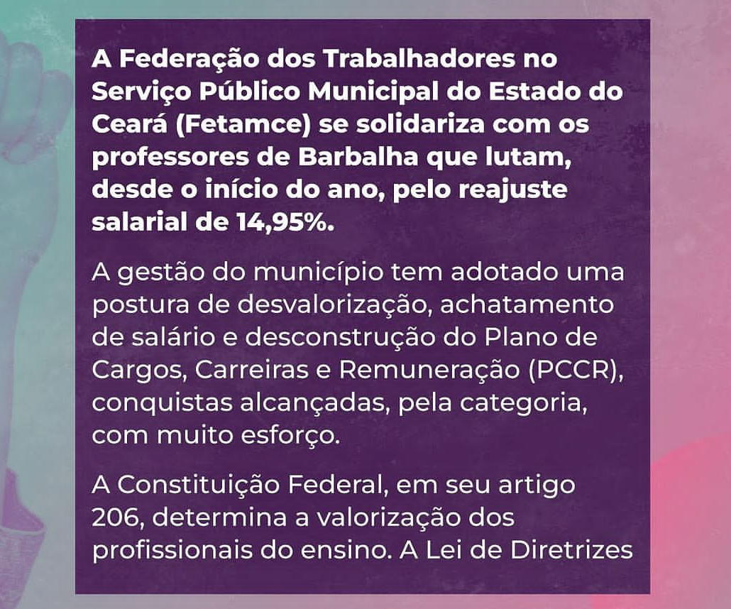 Fetamce lança nota de solidariedade aos professores e professoras de BARBALHA, que permanecem na luta pelos 14,95% de reajuste. 10/07/2023 0 Comentário(s) #Compartilhe