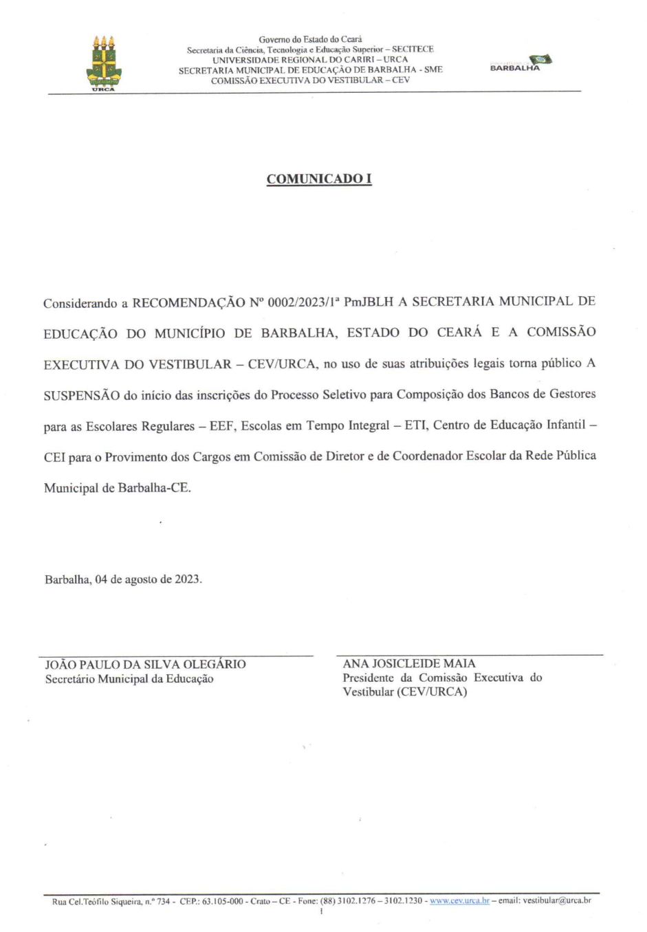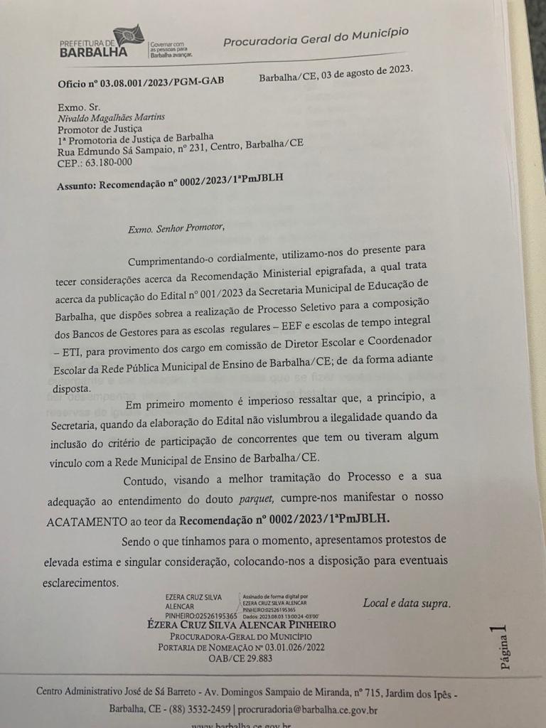 O município de Barbalha e URCA acataram no dia 4 de agosto de 2023 a recomendação feita pelo ministério público estadual para a suspensão do processo seletivo para os cargos comissionados de diretor e coordenador escolar.