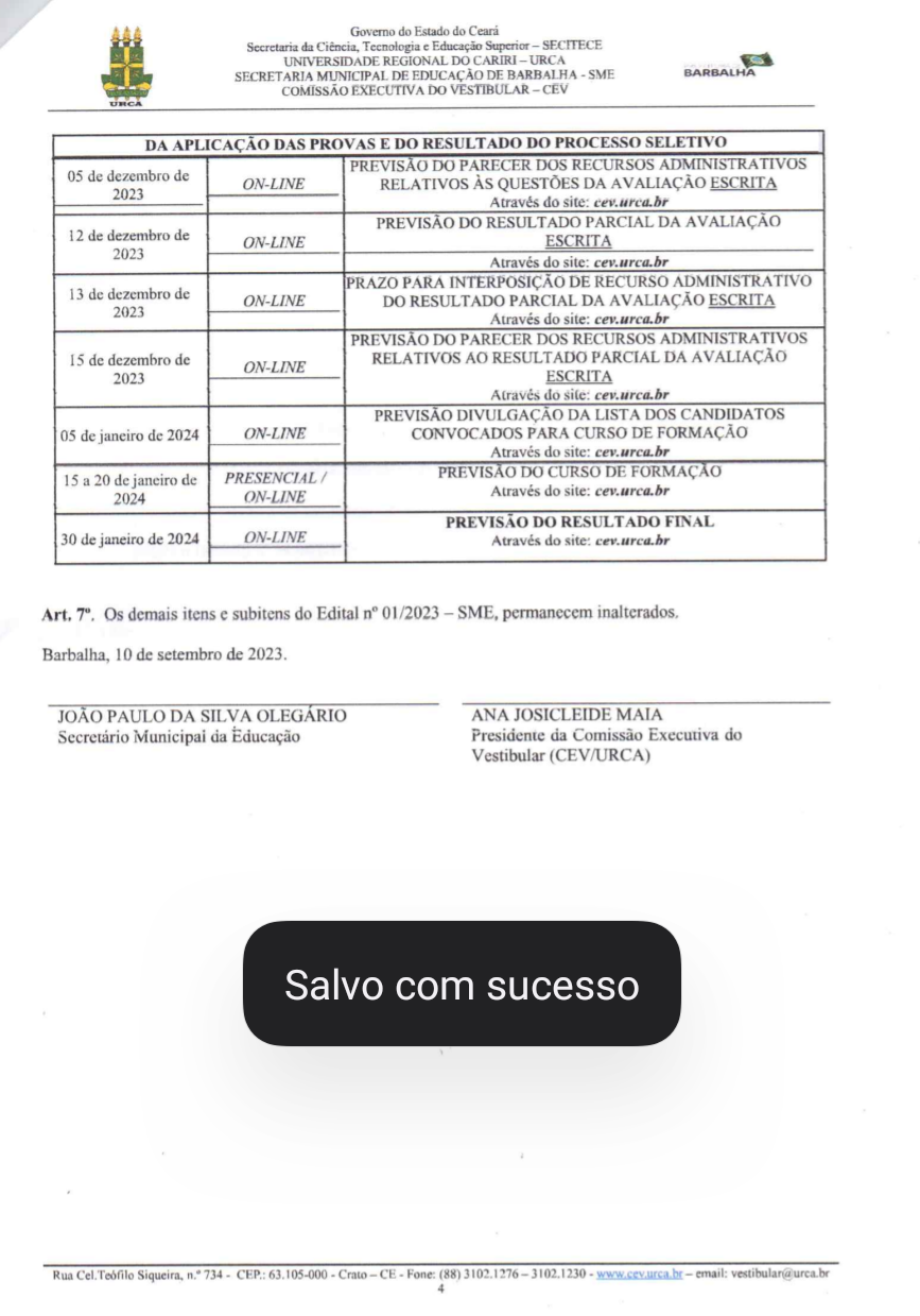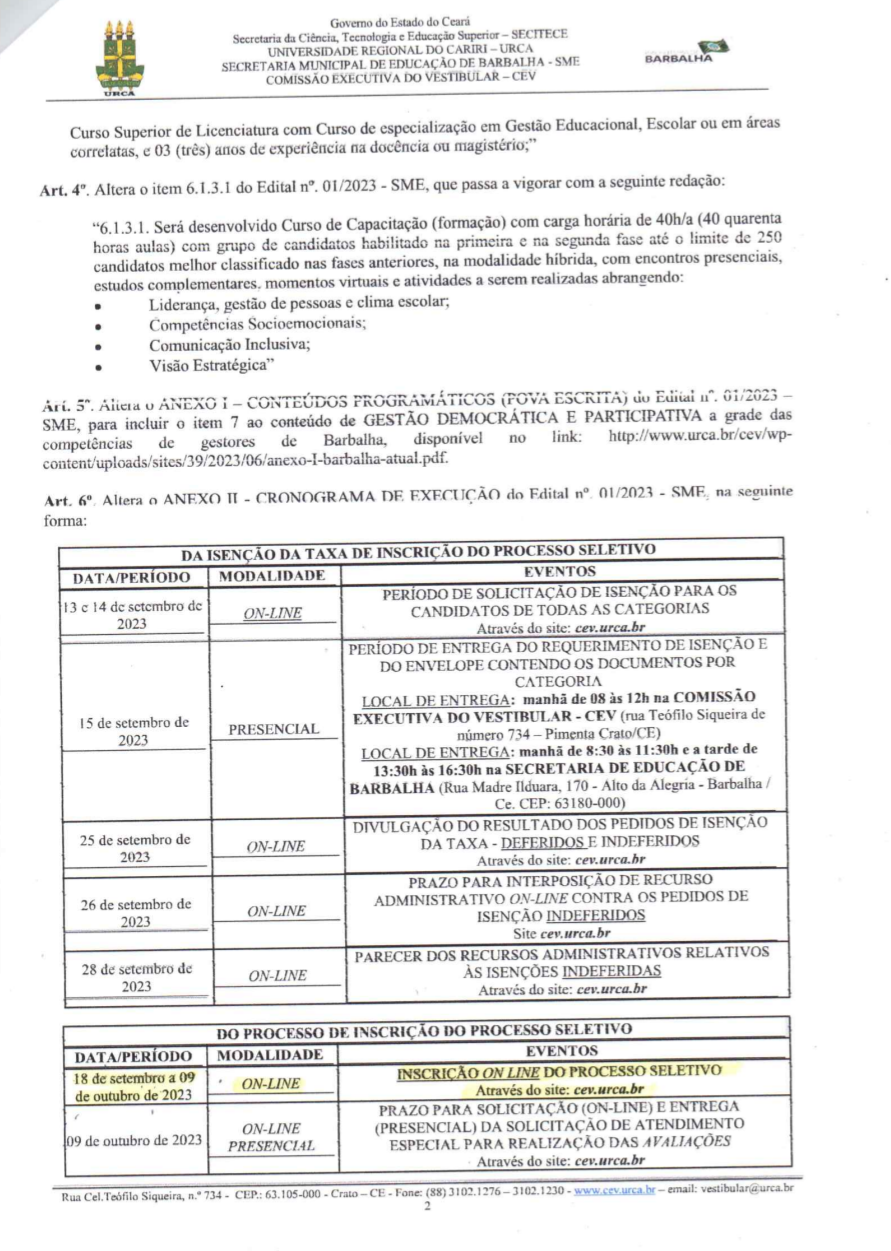 Após a administração atender a Recomendação de nº 002/2023, de lavra da 1ª Promotoria de Justiça de Barbalha, fora divulgado no dia 10 de setembro o aditivo 01/2023, constando todas as informações com os ajustes do Processo Seletivo, conforme documento em anexo.