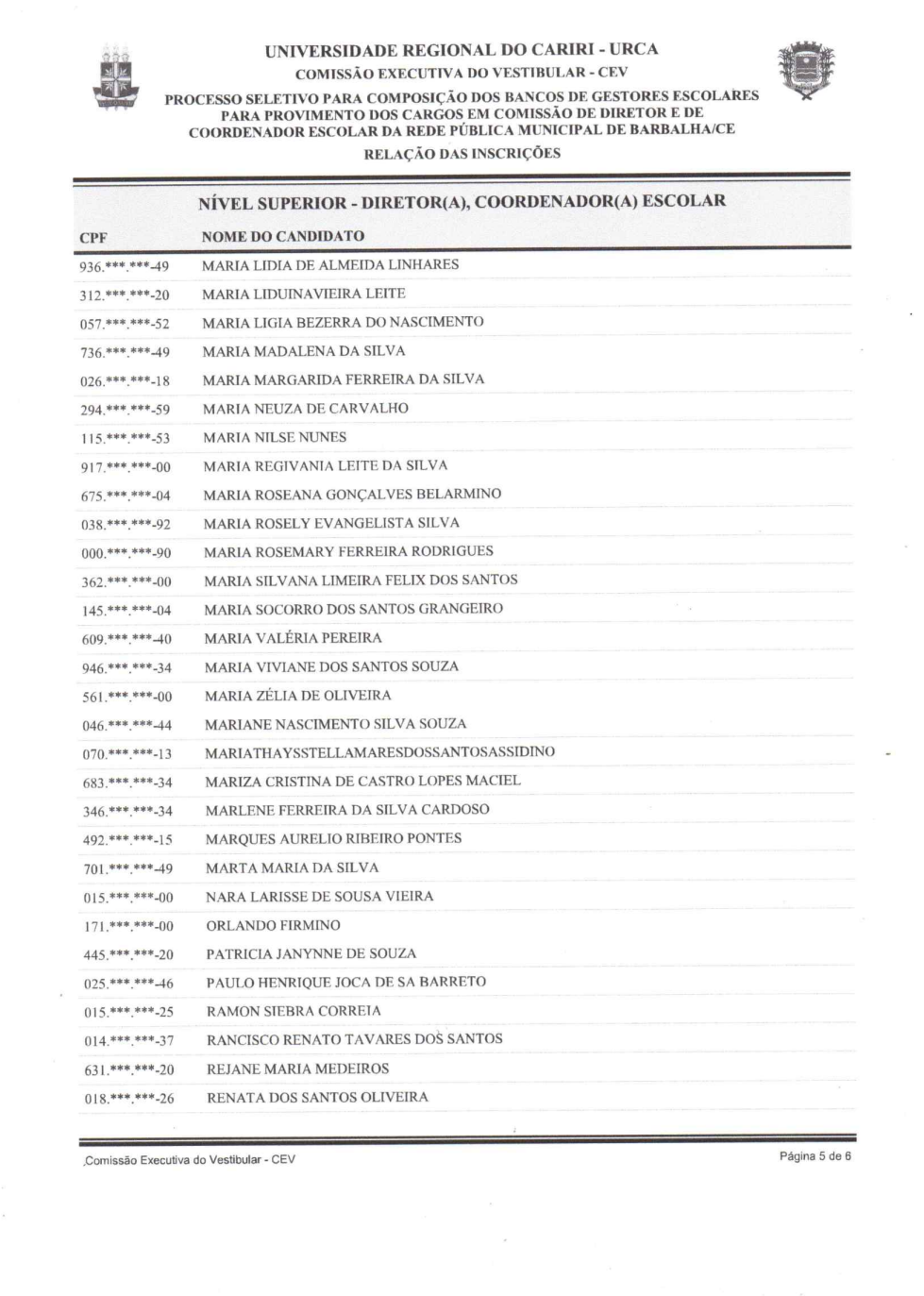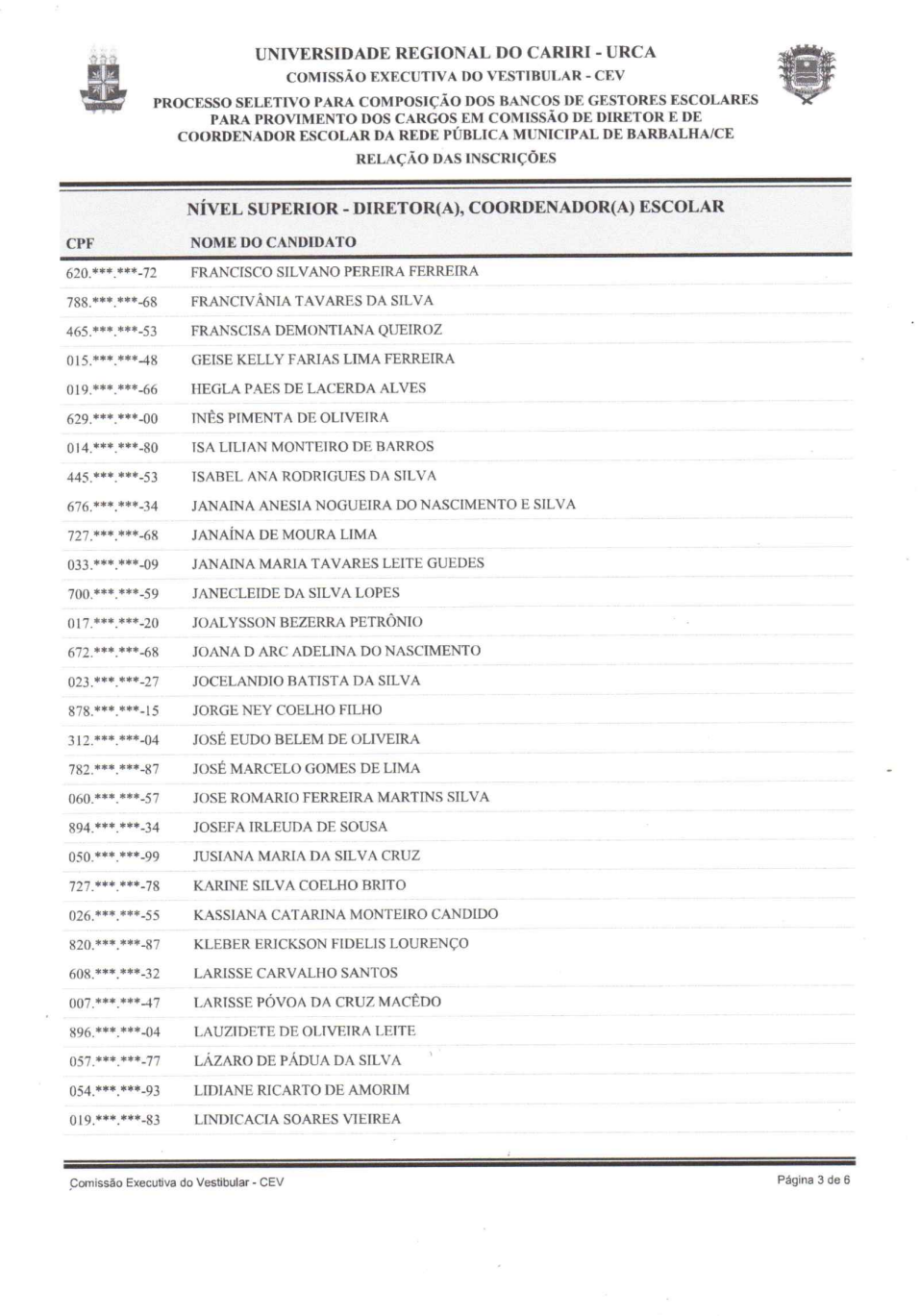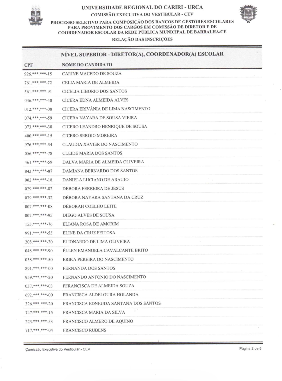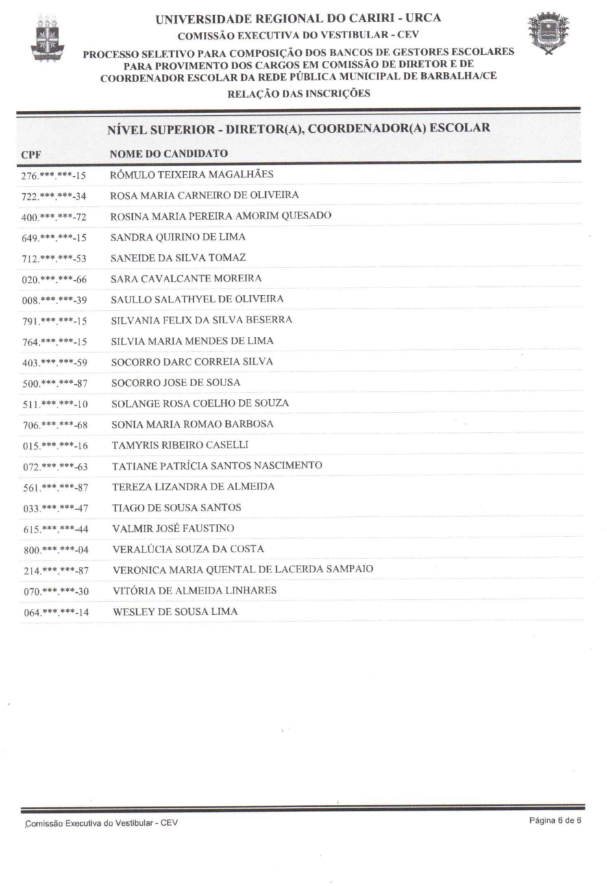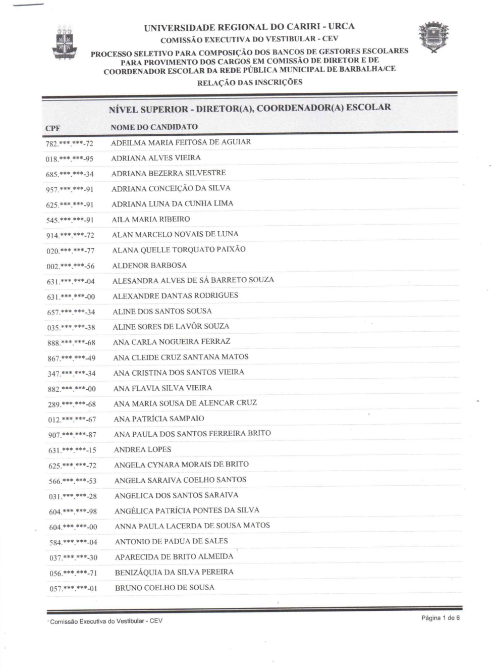 Segue abaixo, as inscrições deferidas dos candidatos para Composição do Banco de Gestores das Escolares Regulares, Escolas em Tempo Integral e Centro de Educação Infantil da Rede Pública Municipal de Barbalha/CE.