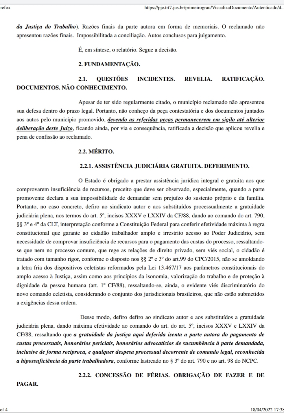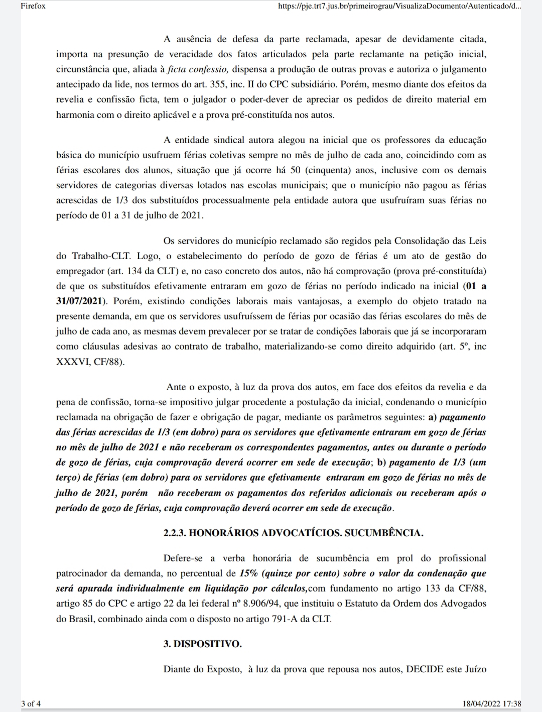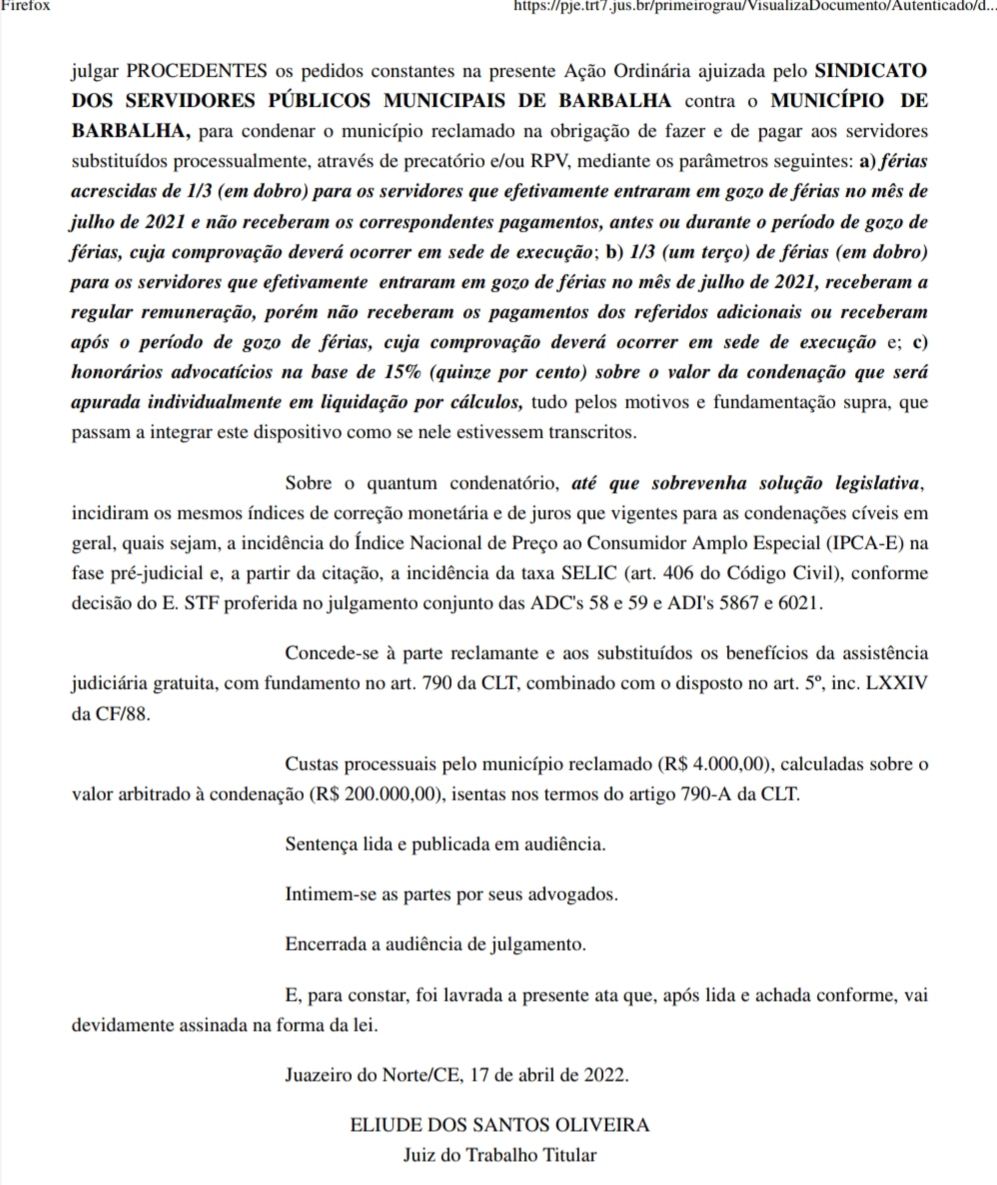 A justiça do trabalho através de sentença proferida pelo juiz Eliude dos Santos Oliveira deu ganho de causa a uma ação coletiva movida pelo SINDMUB onde foi pedido o pagamento das férias acrescidas de 1/3 em dobro para diversos professores e trabalhadores da secretaria de educação. O processo teve por motivo o fato dos servidores terem gozado férias no mês de julho de 2021 como de costume e o município ter se negado a efetivar o pagamento da remuneração e do adicional de férias, no prazo de até dois dias antes do gozo, como manda o artigo 145 da clt e a súmula 450 do TST. Sob esses fundamentos o município foi condenado a pagar aos servidores relacionados no processo a remuneração das férias acrescidas de 1/3 de forma dobrada. A decisão judicial ainda cabe recurso, no entanto se espera que neste ano de 2022 o município através da secretaria de educação não venha incorrer no mesmo erro, causando prejuízo ao erário público municipal desnecessário, em face do pagamento de parcelas salariais em dobro por determinação judicial. Em anexo sentença do processo.