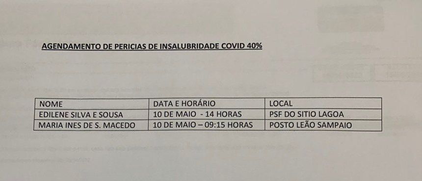 Perito continua fazendo perícia nas unidades básicas de saúde do município de Barbalha. O SINDMUB ajuizou ação judicial no TRT majorando insalubridade de 40%. Mais duas perícias já marcadas para início de maio a saber... segue anexo.